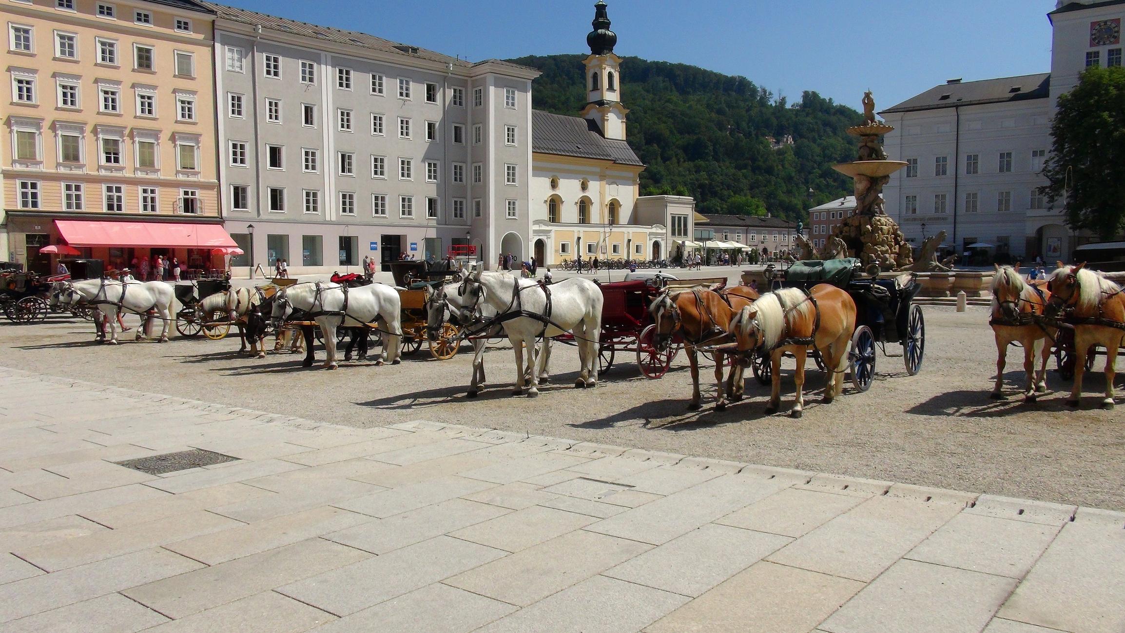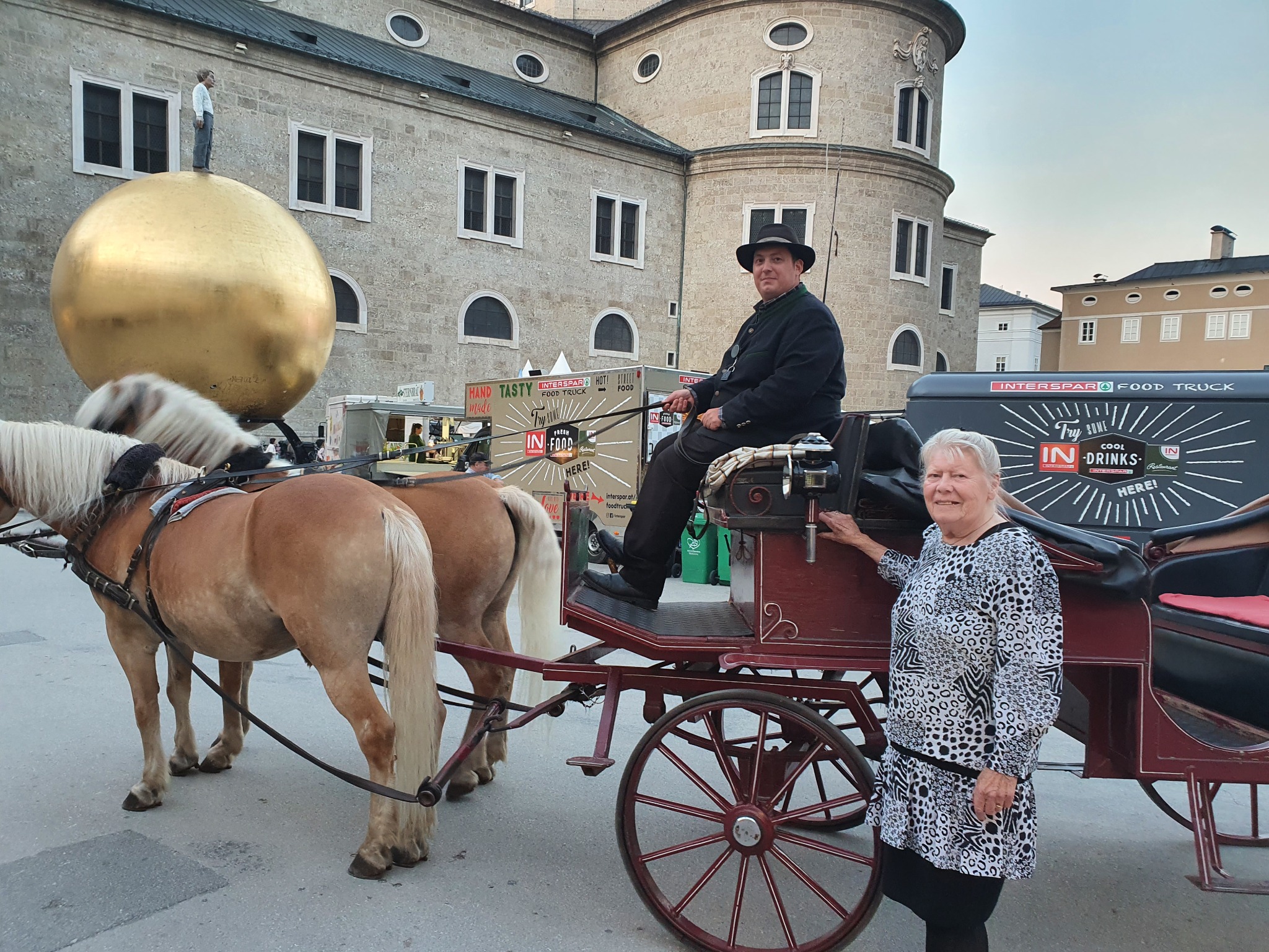 A private horse-drawn carriage was arranged through the historic center of Salzburg. Passing baroque squares and elegant avenues, she waved to bystanders. Smiling. Present. Fully in the moment.